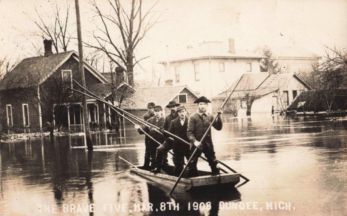 Dundee sits on the River Raisin, which has a long history of flooding during heavy rain, thaw and ice breakup. The postcard’s handwritten-style title — “The Brave Five” — suggests these guys became local legends for getting around when streets disappeared.