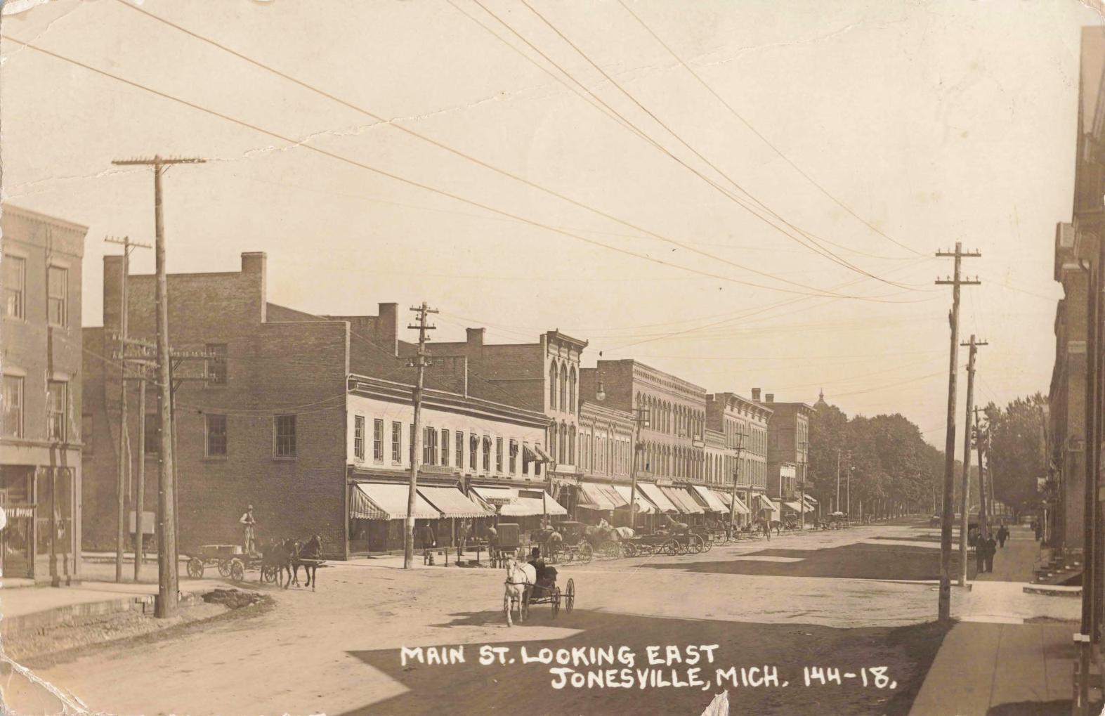Early 1900s Jonesville was a busy village of roughly 1,300 people (population rose from 1,307 in 1900 to 1,396 by 1910). Streets were lined with two-story brick storefronts.