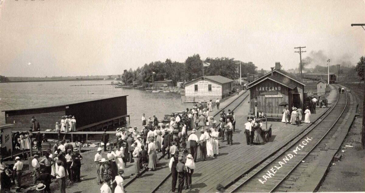 Lakeland was a resort stop on Zukey Lake on the Huron River’s Chain of Lakes. The Ann Arbor Railroad reached Lakeland in 1878, and travelers could step off the train and onto the water. By 1897, steam-powered passenger boats were running, meeting trains and shuttling people around the chain.