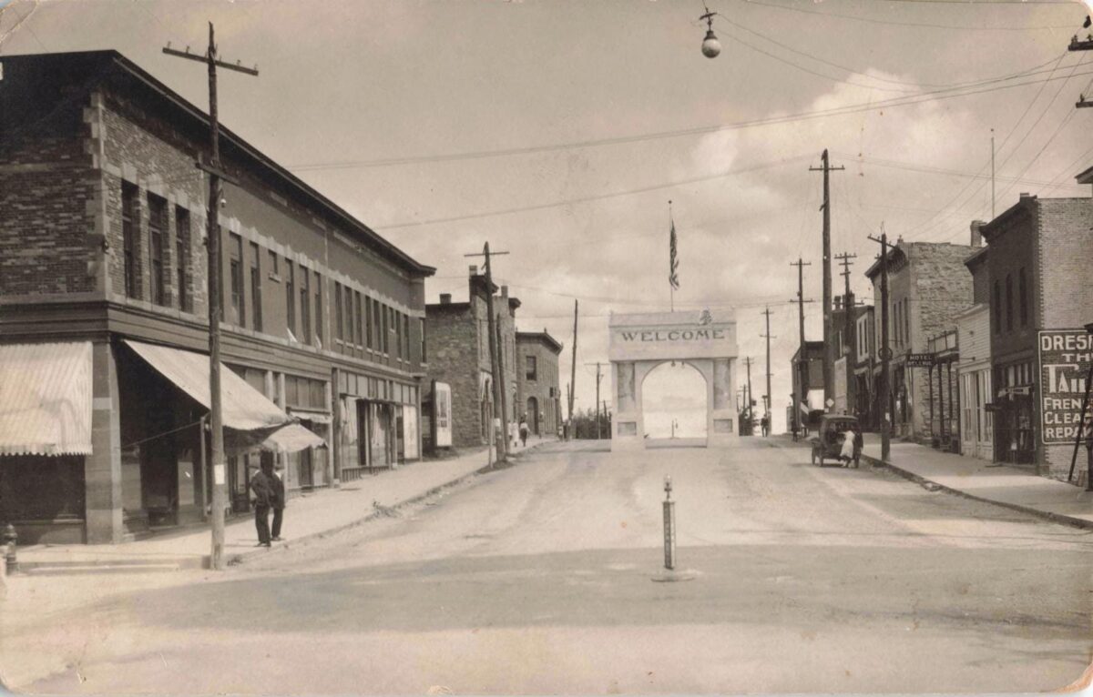 A big “WELCOME” arch spans the street in this early view of downtown Munising, Michigan, with wooden sidewalks, brick storefronts and a few cars parked along the curb.
